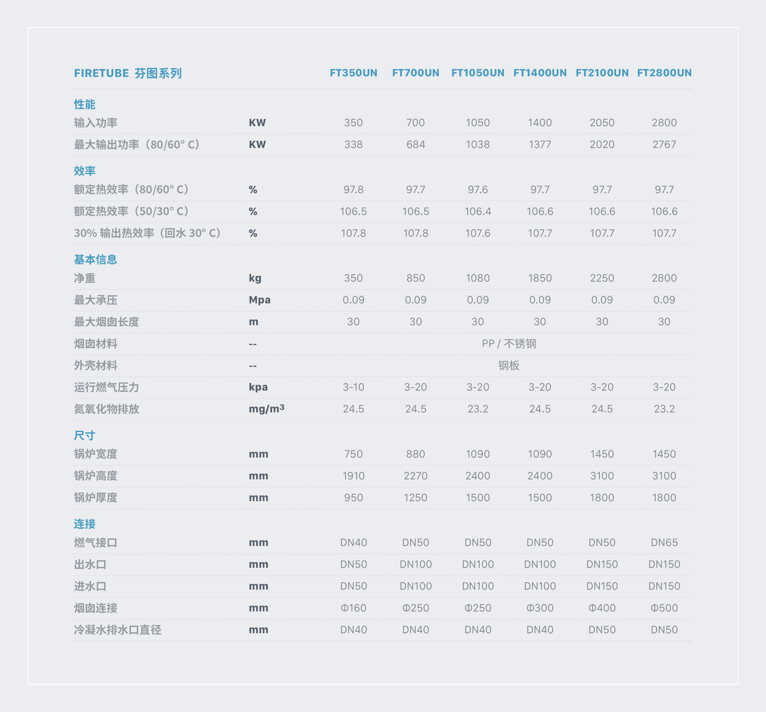 芬图冷凝锅炉的单台功率从350KW到2800KW,能达到如此大的锅炉功率输出要归功于独特的内置铝翅片的不锈钢火管设计,耐腐蚀的挤压铝翅片,更大的火管直径。